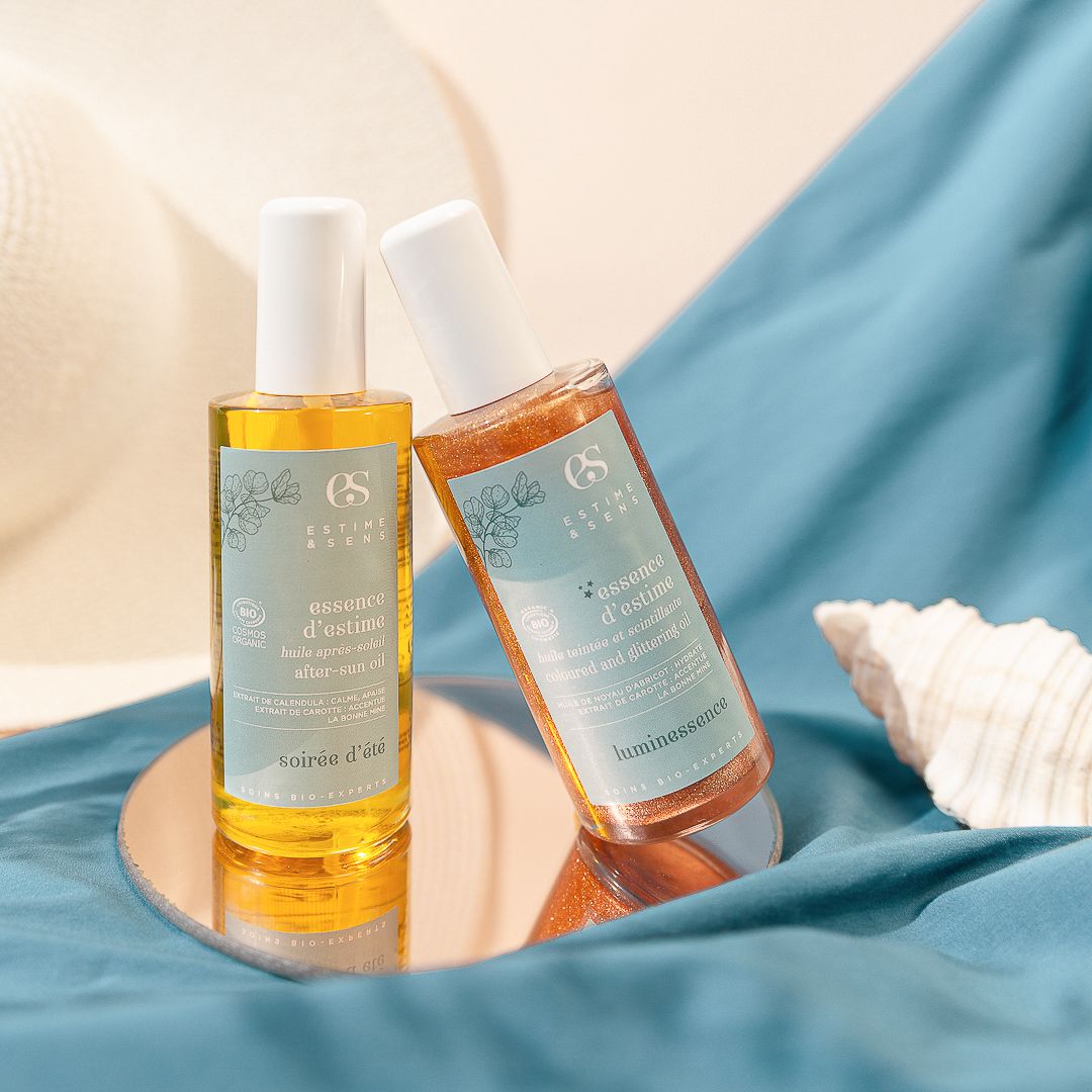 Réparée et lumineuse, grâce à l’application des essences d’Estime Soirée D’été qui répare et prolonge le teint hâlé et Luminessence qui met en valeur votre bronzage avec ses paillettes.